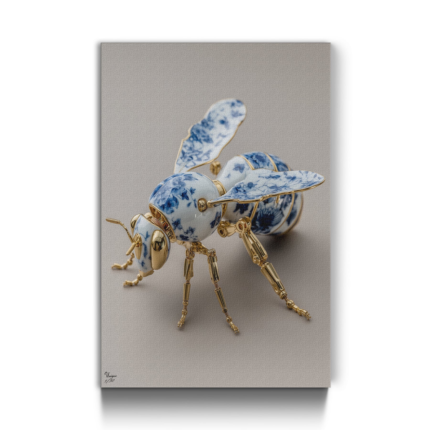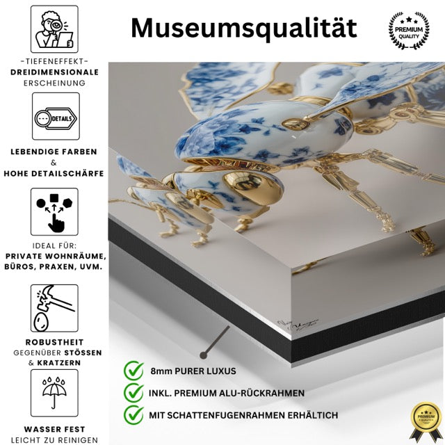 Eine kunstvoll gestaltete Biene aus Porzellan mit floralen Delfter-Blue-Motiven, kombiniert mit glänzenden Gold-Elementen, die Luxus und Eleganz ausstrahlen.