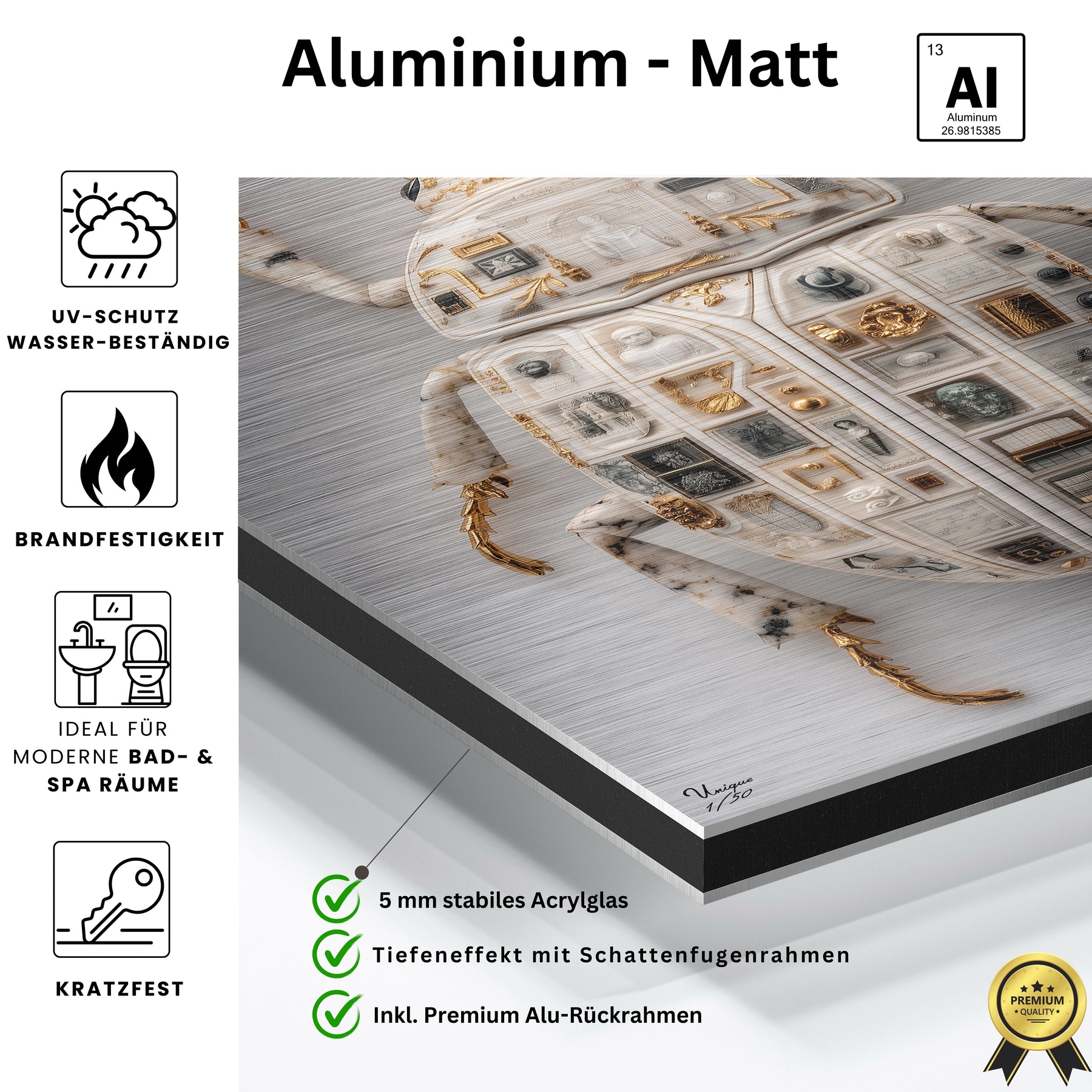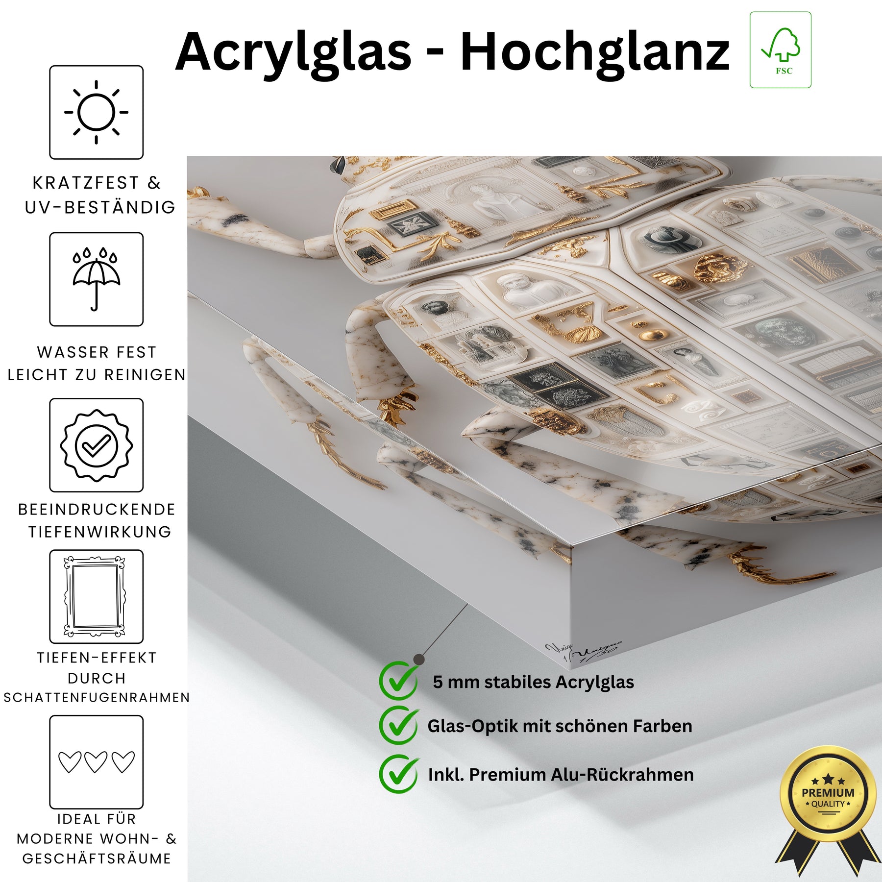 • Materialien: Hochwertiges Acrylglas (glänzend) und Alu-Dibond (matt)