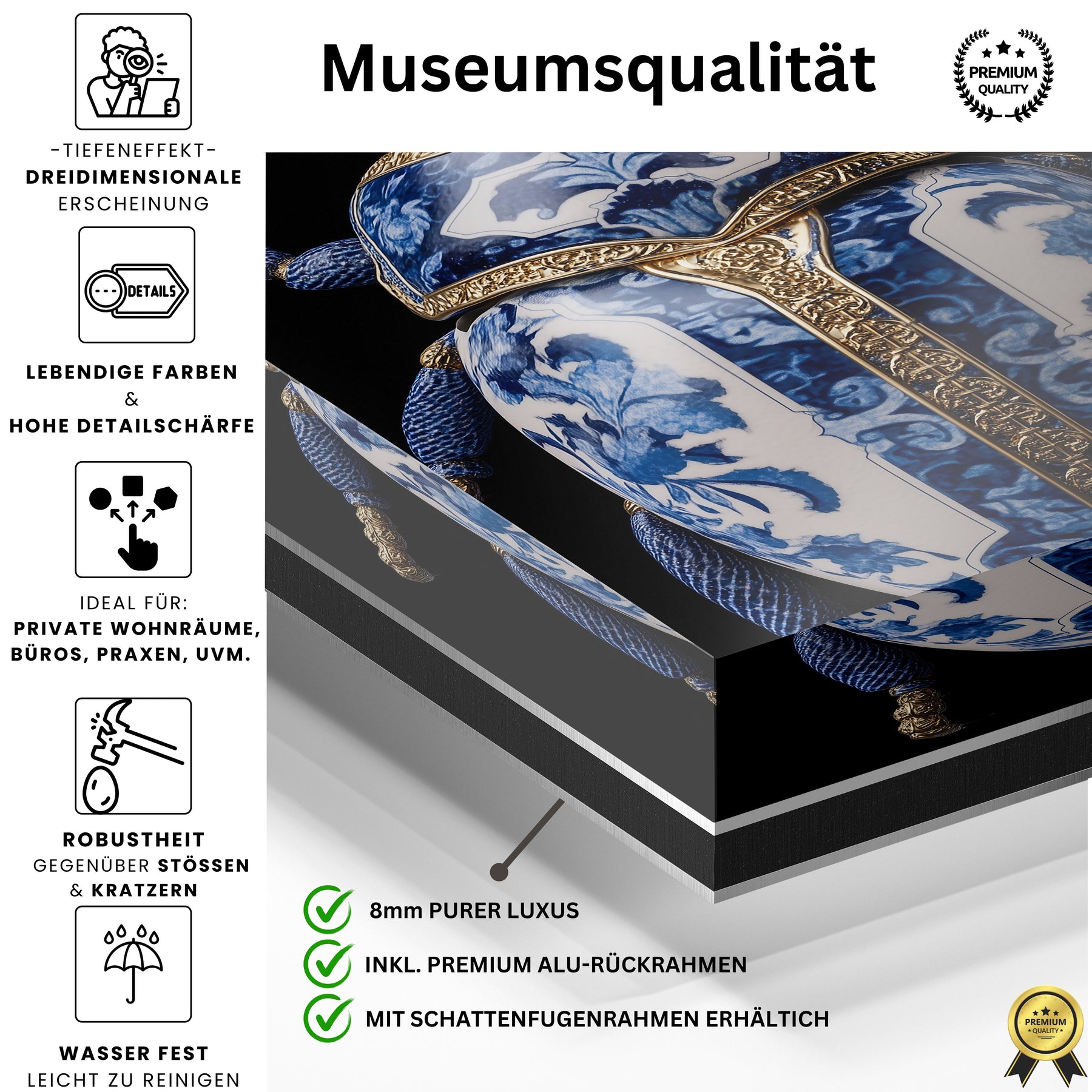 Design: Feine Delfter Blue Muster, goldene Ornamente, eleganter Weiß-Blau-Kontrast