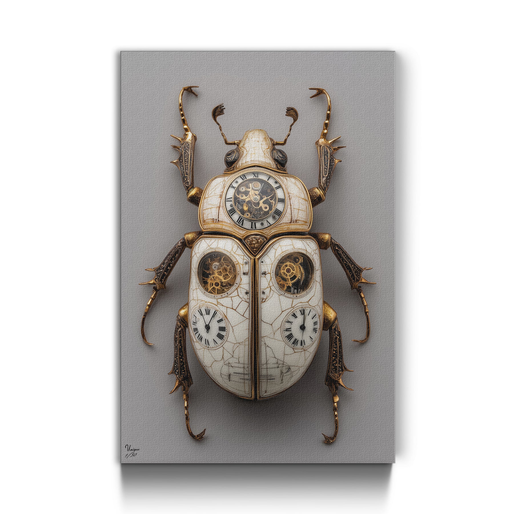 Der Steampunk Zeitmesser Käfer verbindet historische Eleganz mit technischer Präzision. Die sichtbaren Zahnräder und Uhrwerke wirken wie aus einer antiken Uhrmacherei entnommen, während die strukturierte Porzellanoberfläche dem Werk Tiefe, Charakter und hochwertige Haptik verleiht.