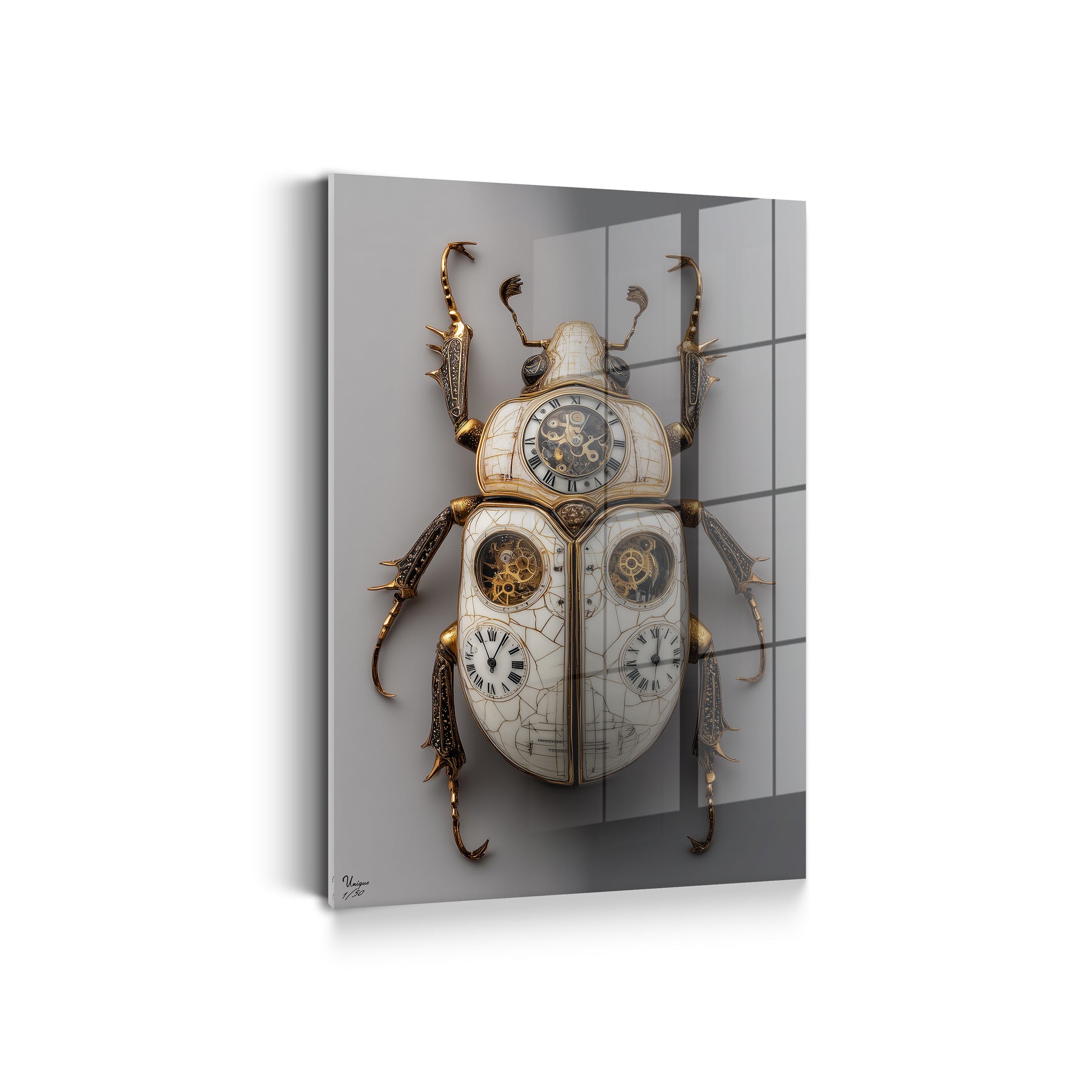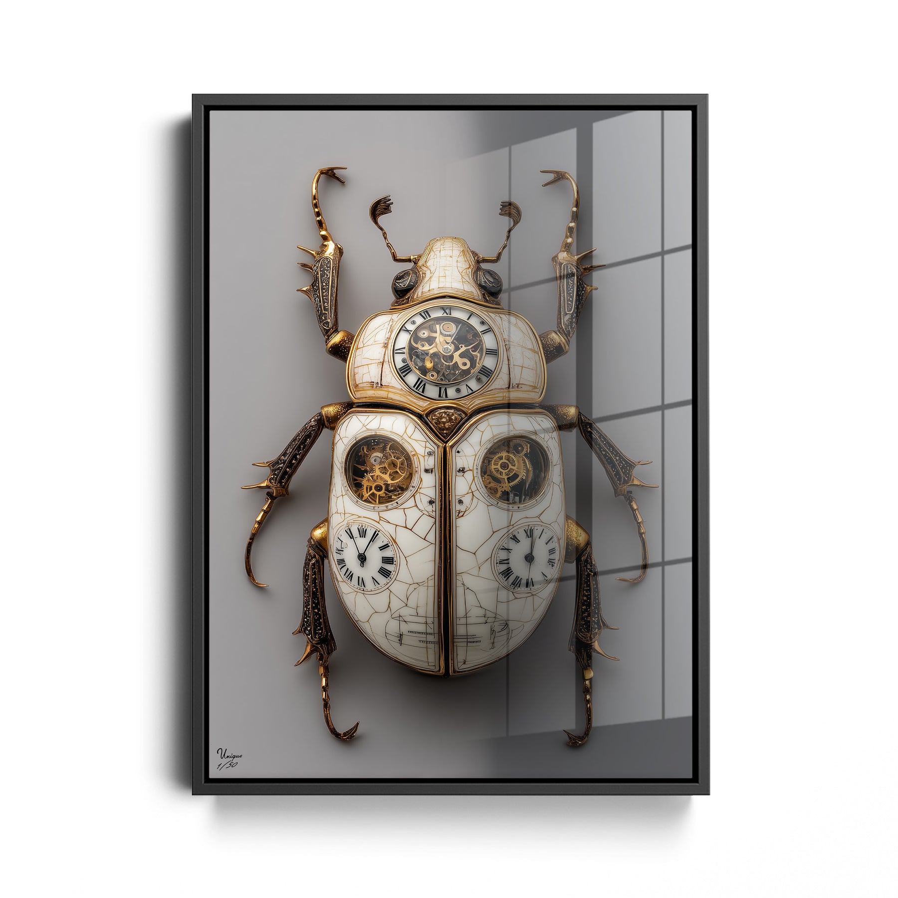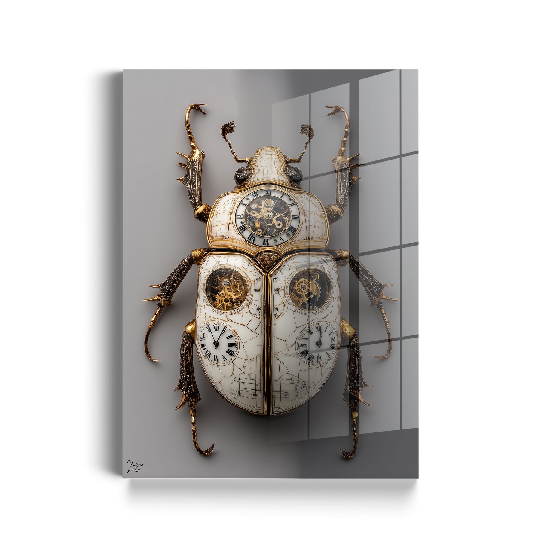 Der „Steampunk Zeitmesser Käfer“ vereint kunstvolle Mechanik, antike Uhrwerke und luxuriöse Porzellanoptik zu einem einzigartigen Kunstobjekt. Auf seinem detailreichen Körper verschmelzen feine Risse im Porzellan, sichtbare Zahnräder, mehrere Uhranzeigen und goldene Ornamente zu einer faszinierenden Fusion aus Vintage-Eleganz und futuristischer Präzision.
