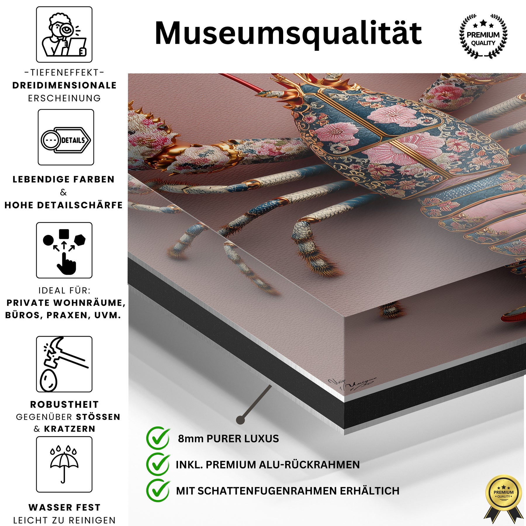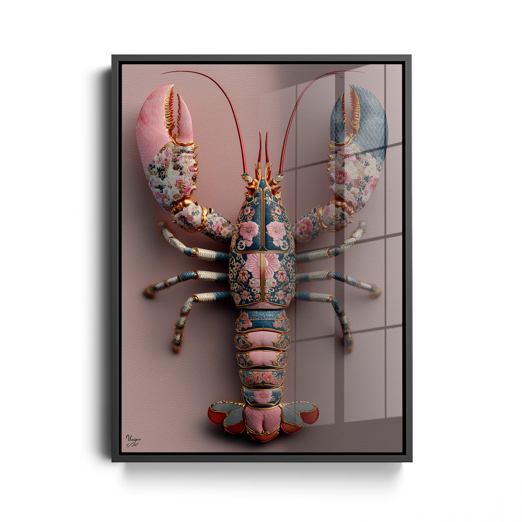 Ich achte extrem auf Details – bei Mode genauso wie bei Interior. Und genau deshalb hat mich dieses Motiv überzeugt. Die feinen floralen Muster, die Struktur, die Farben im Hummer selbst… das wirkt fast wie ein Couture-Piece an der Wand. Es ist mutig, aber unfassbar elegant.