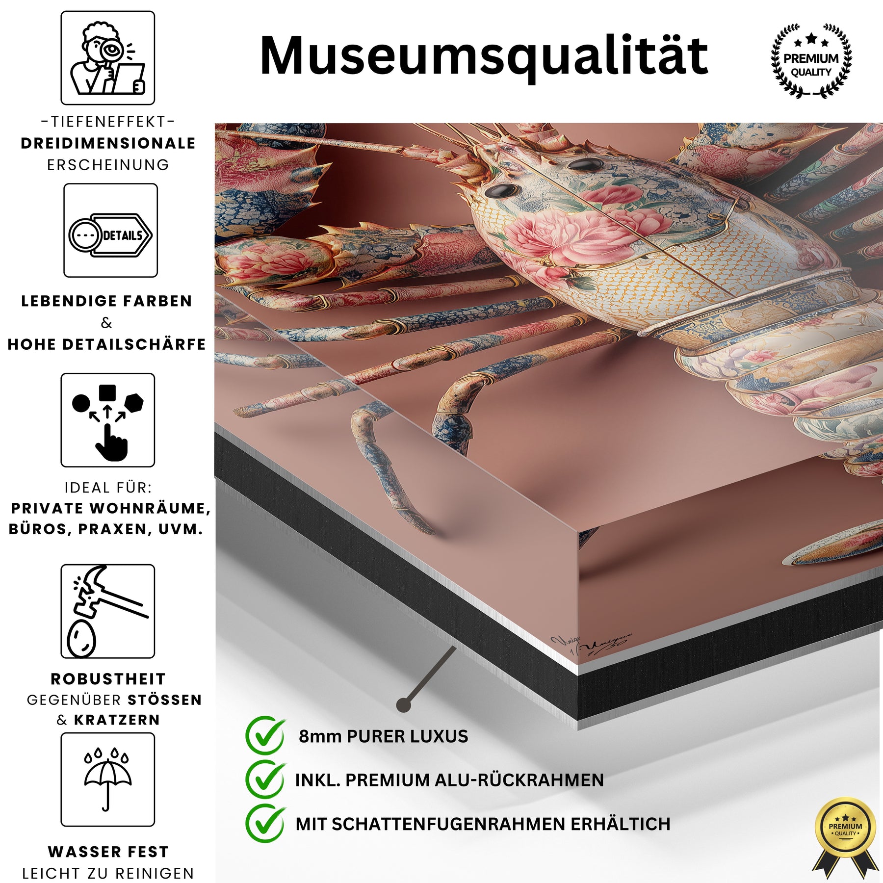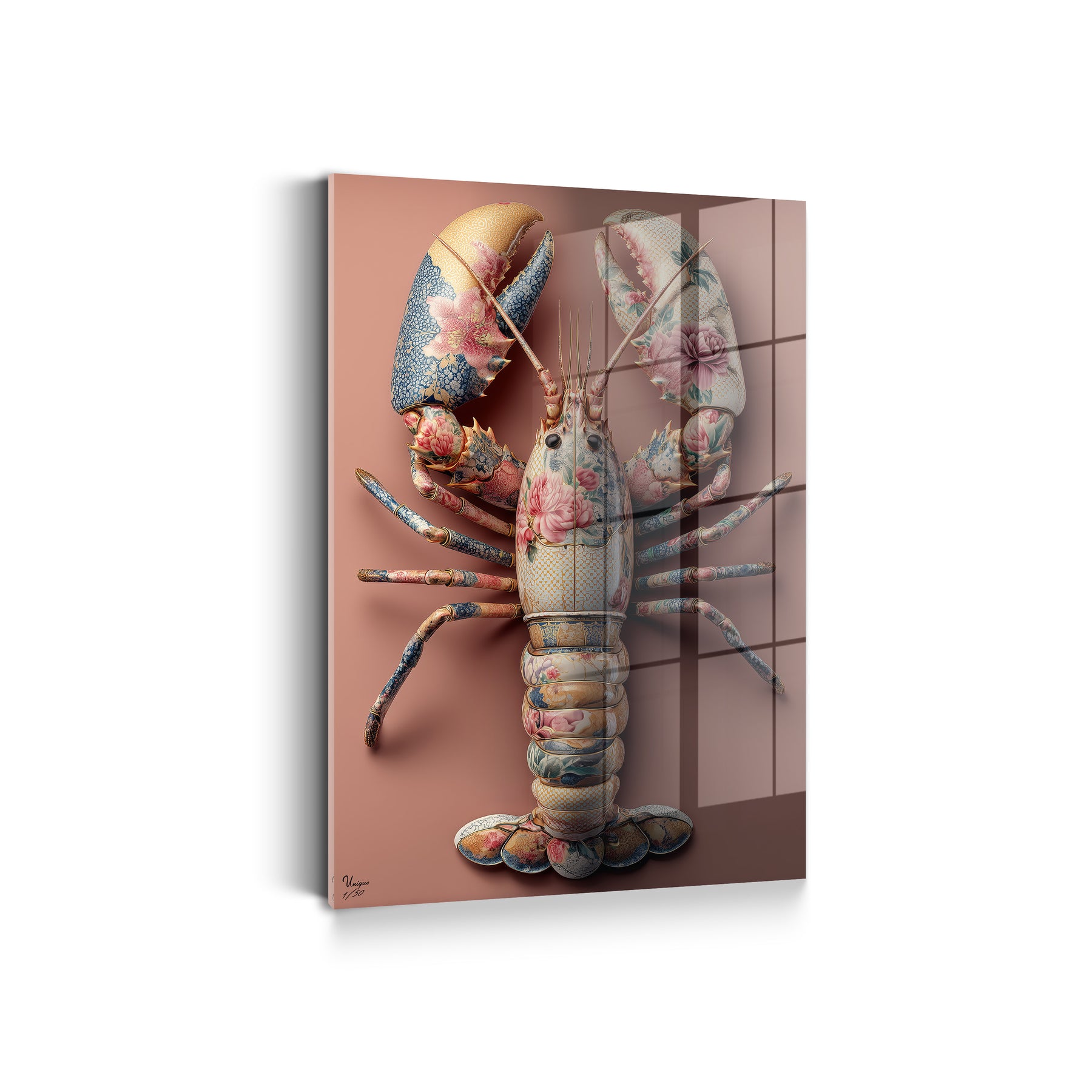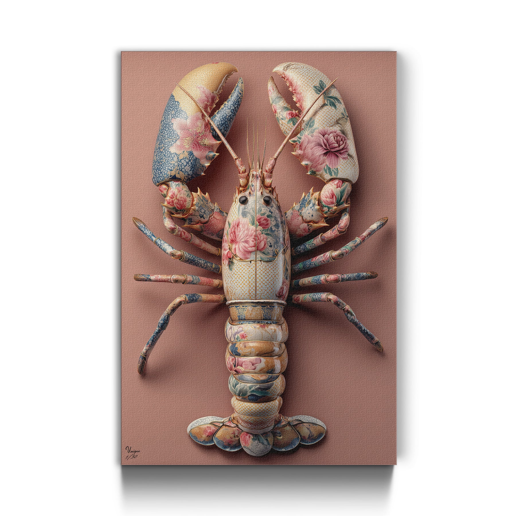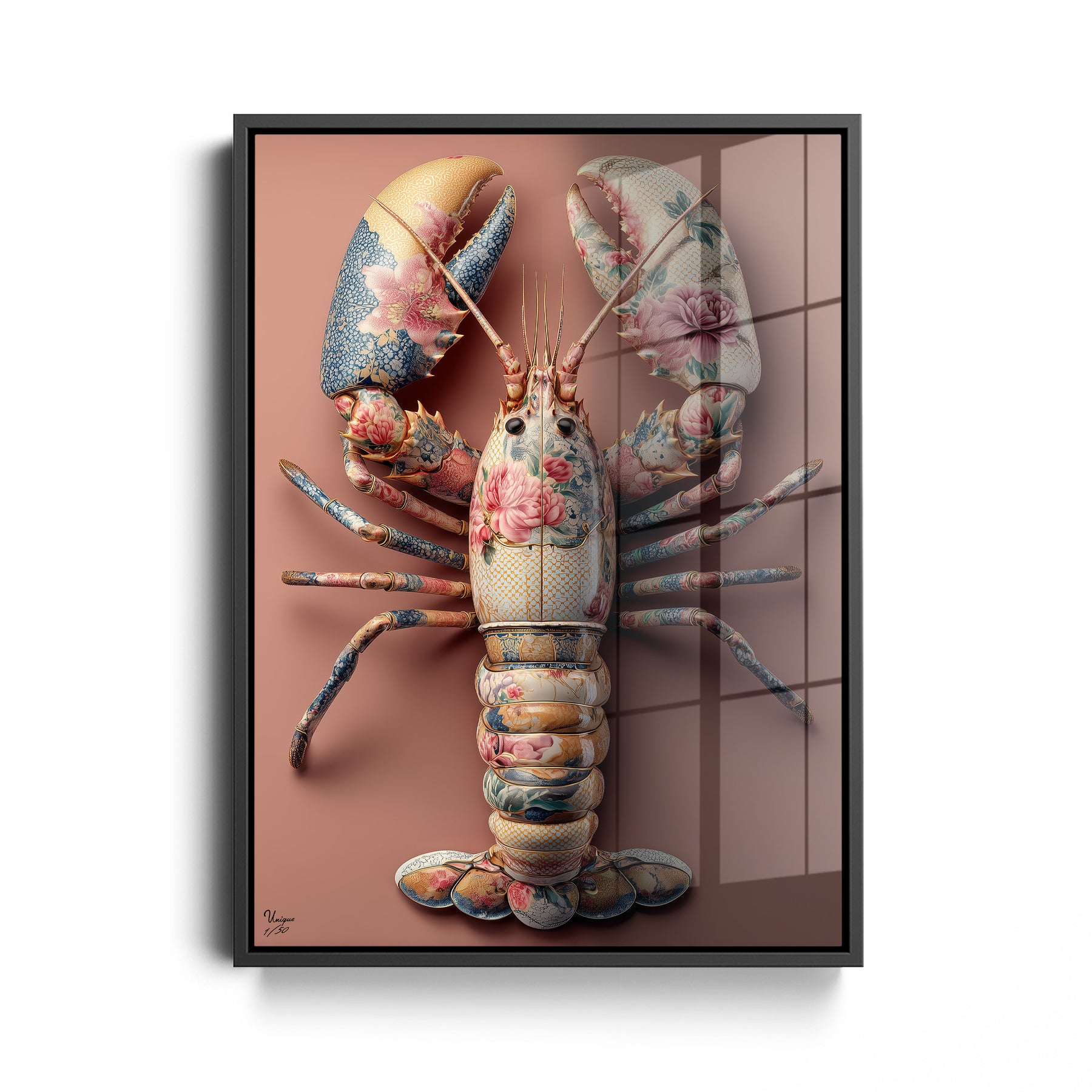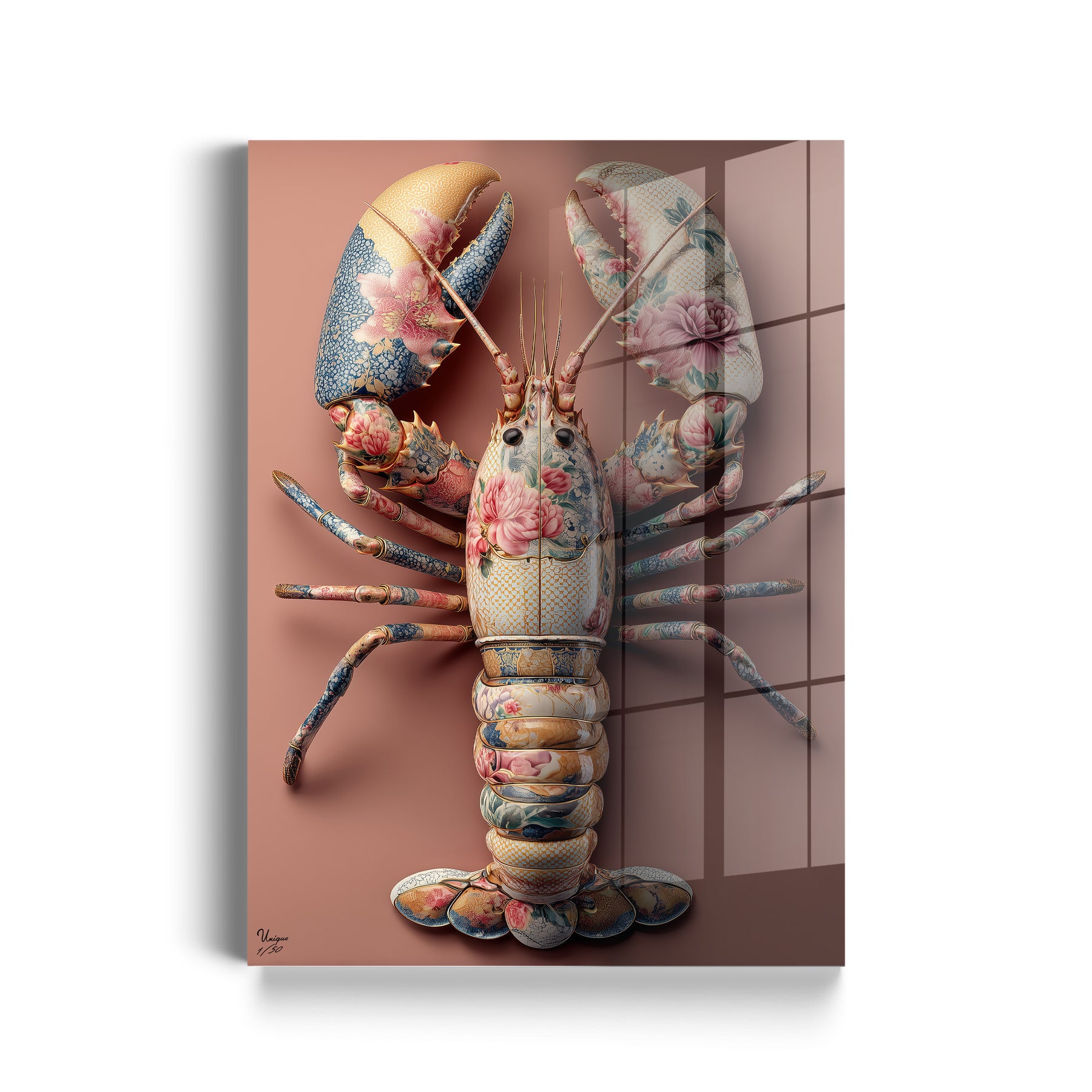 Ich achte extrem auf Details – bei Mode genauso wie bei Interior. Und genau deshalb hat mich dieses Motiv überzeugt. Die feinen floralen Muster, die Struktur, die Farben im Hummer selbst… das wirkt fast wie ein Couture-Piece an der Wand. Es ist mutig, aber unfassbar elegant.