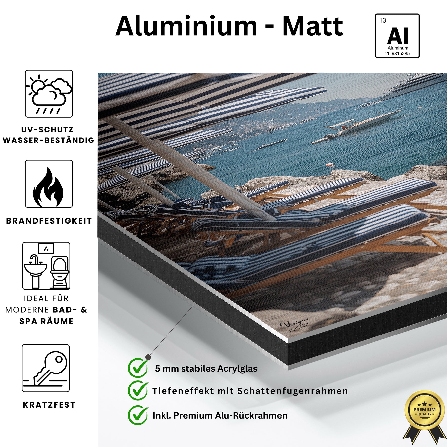 Aluminium- oder Acryl-Veredelung schützt vor Ausbleichen.