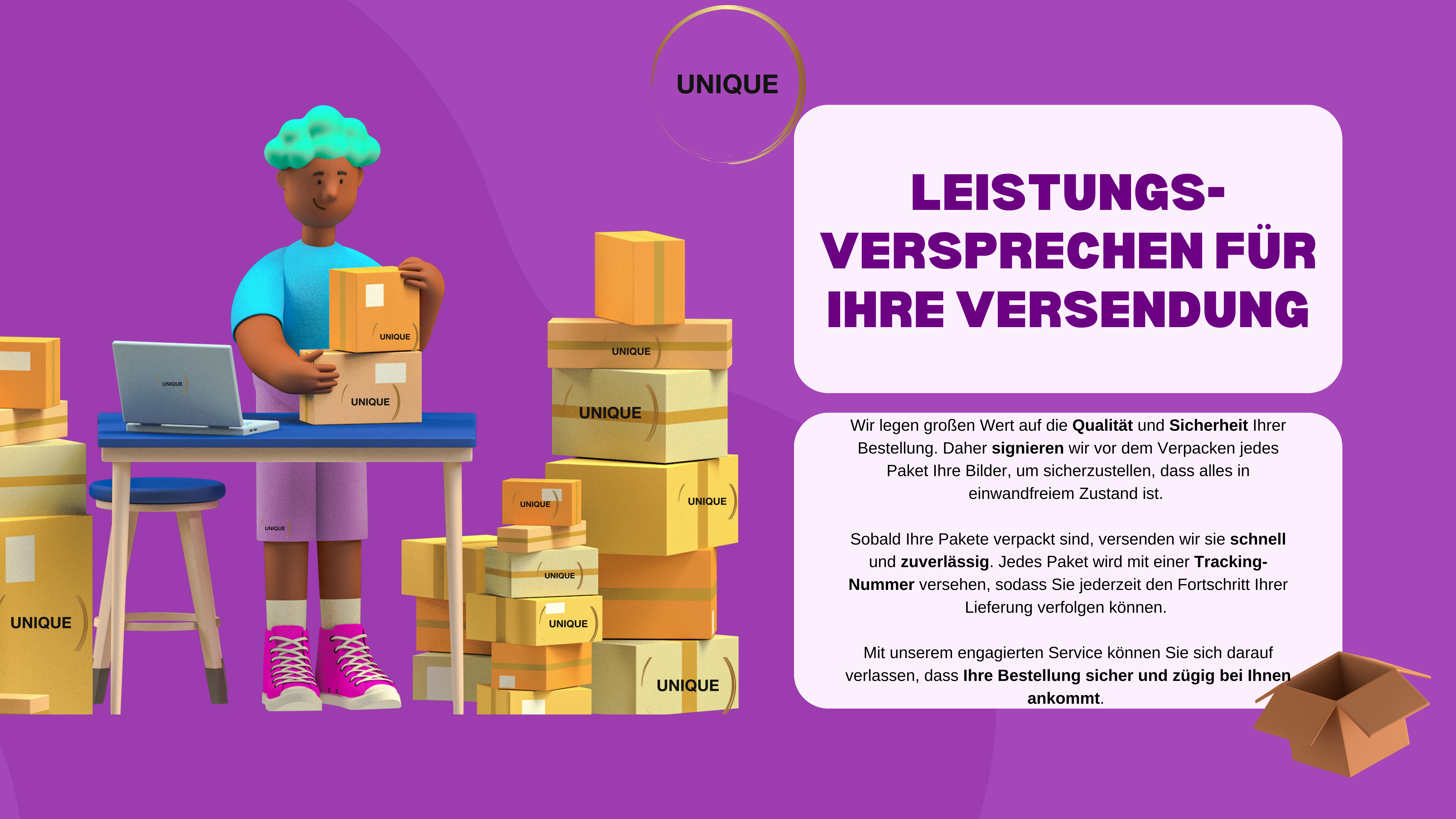 Bei Unique-Bild.de legen wir großen Wert auf einen reibungslosen und transparenten Versandprozess. Alle unsere Lieferungen werden nachverfolgbar aus Deutschland verschickt, sodass Sie jederzeit den Status Ihrer Bestellung mit einer Sendungsnummer überprüfen können. Normalerweise bearbeiten wir Bestellungen innerhalb von 1-2 Werktagen, und die Lieferung erfolgt in der Regel innerhalb von 3-4 Werktagen. In Ausnahmefällen, beispielsweise bei hoher Nachfrage, kann es jedoch zu längeren Lieferzeiten kommen.