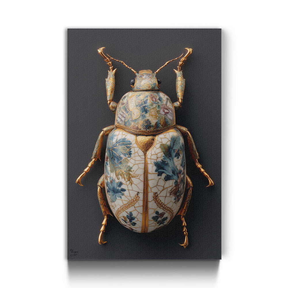 Der „Floraler Porzellan-Käfer“ beeindruckt durch seine feine, fast handwerklich wirkende Ornamentik. Die realistische Porzellanstruktur, kombiniert mit goldenen Linien und kleinen floralen Illustrationen, erzeugt ein anspruchsvolles Kunstwerk von höchster visueller Präzision.