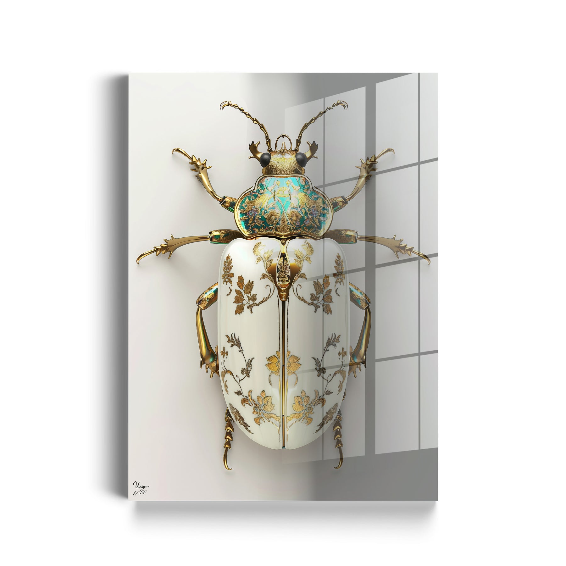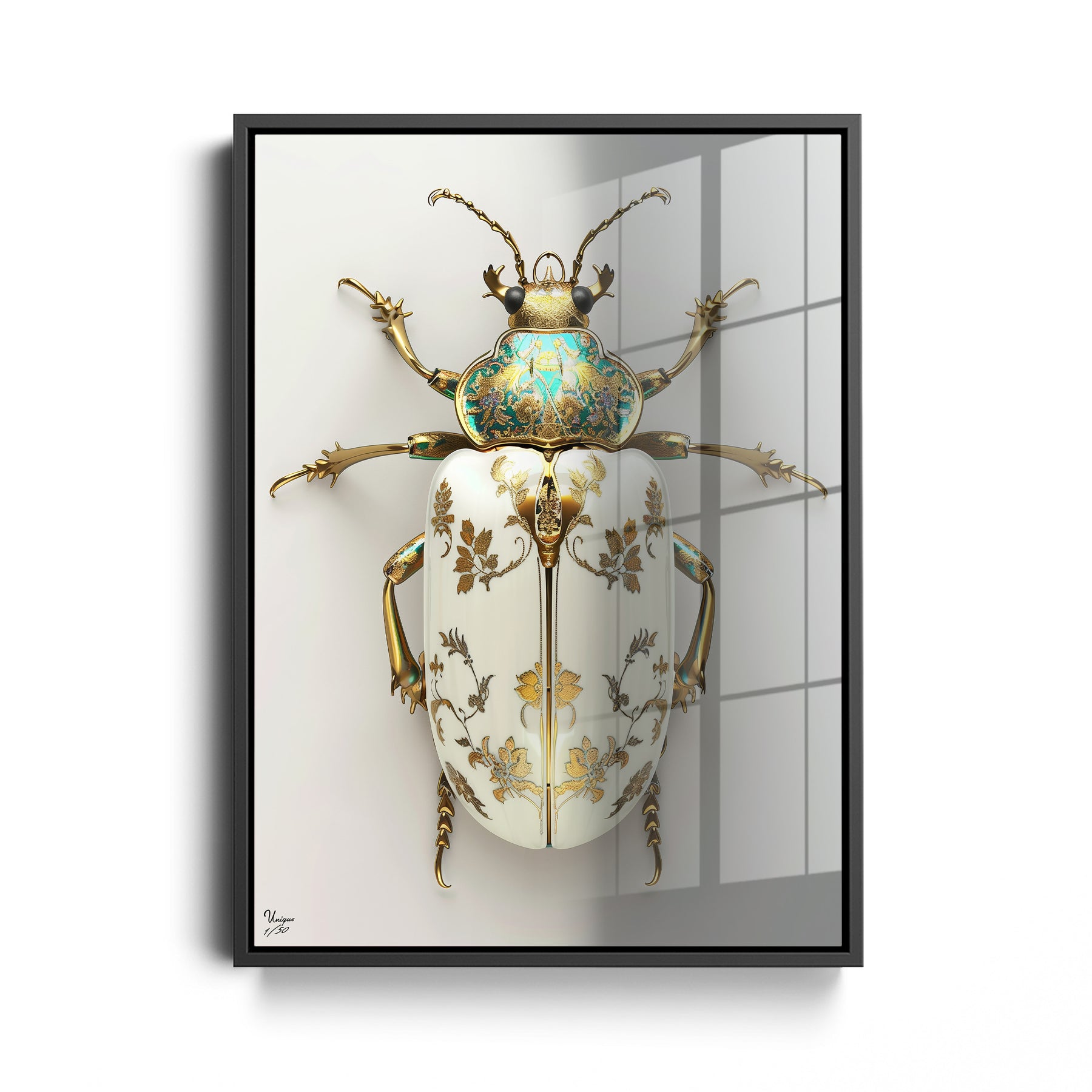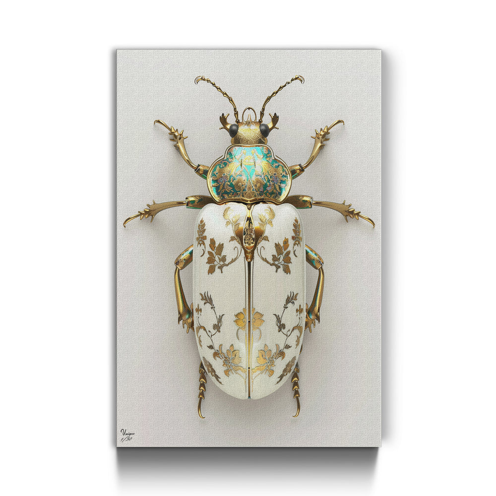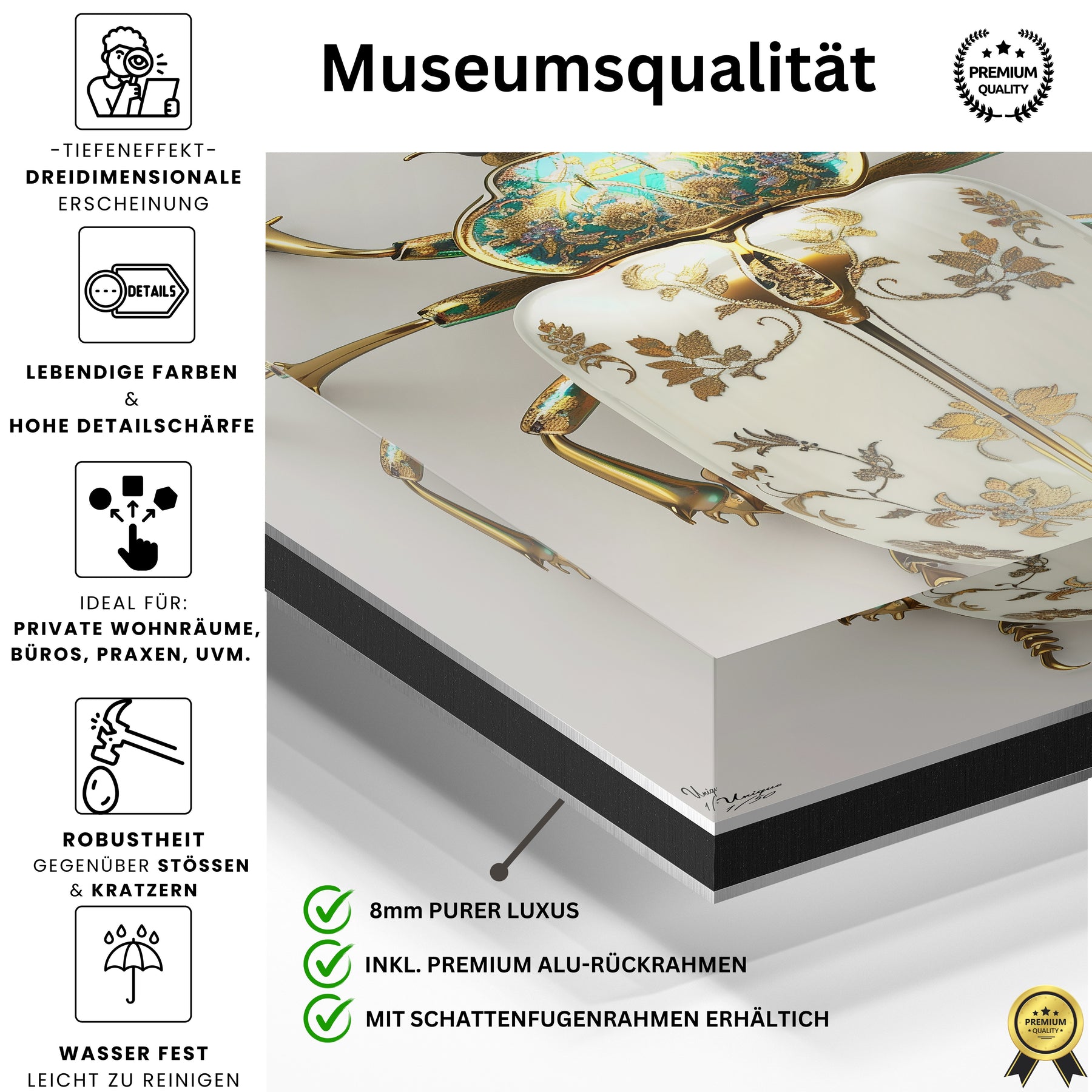 Das Wandbild „Goldener Floralkäfer“ vereint feinste florale Ornamentik, vergoldete Akzente und ein edles Porzellan-inspiriertes Design. Das detailreiche Kunstwerk besticht durch seine harmonische Kombination aus Weiß, Gold und Türkis – ein luxuriöser Eyecatcher, der jeder Umgebung Eleganz verleiht.