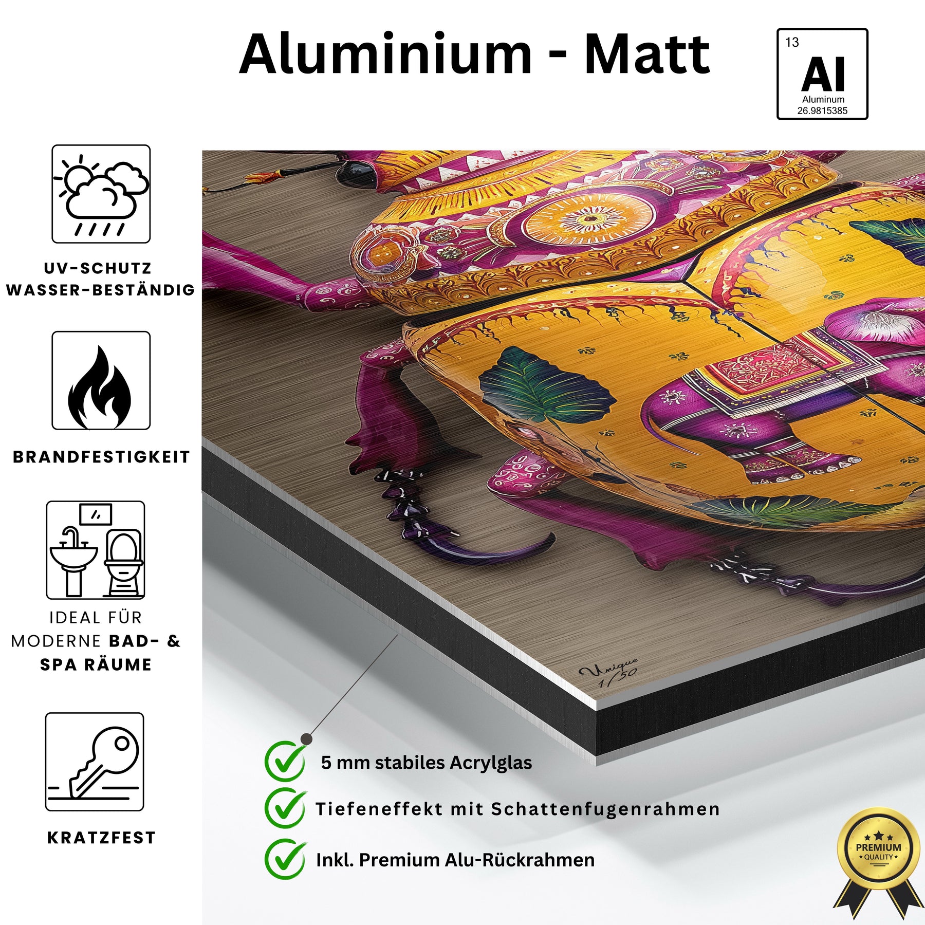 • Materialien: Hochwertiges Acrylglas (glänzend) und Alu-Dibond (matt)