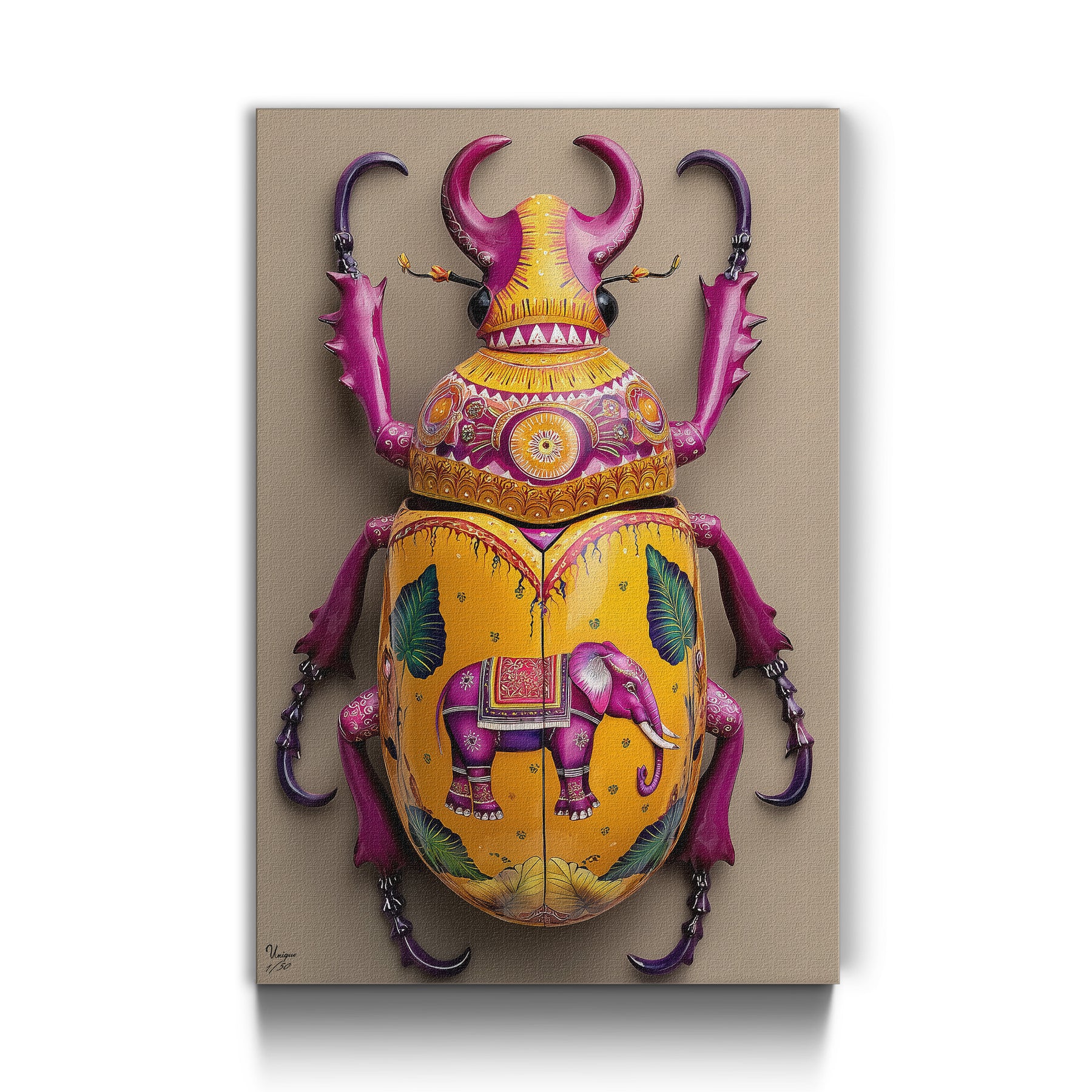 Das Wandbild „Majestätischer Elefantenkäfer“ verbindet feinste Ornamentkunst, leuchtende Farben und luxuriöse indische Motive zu einem beeindruckenden Kunstwerk.
