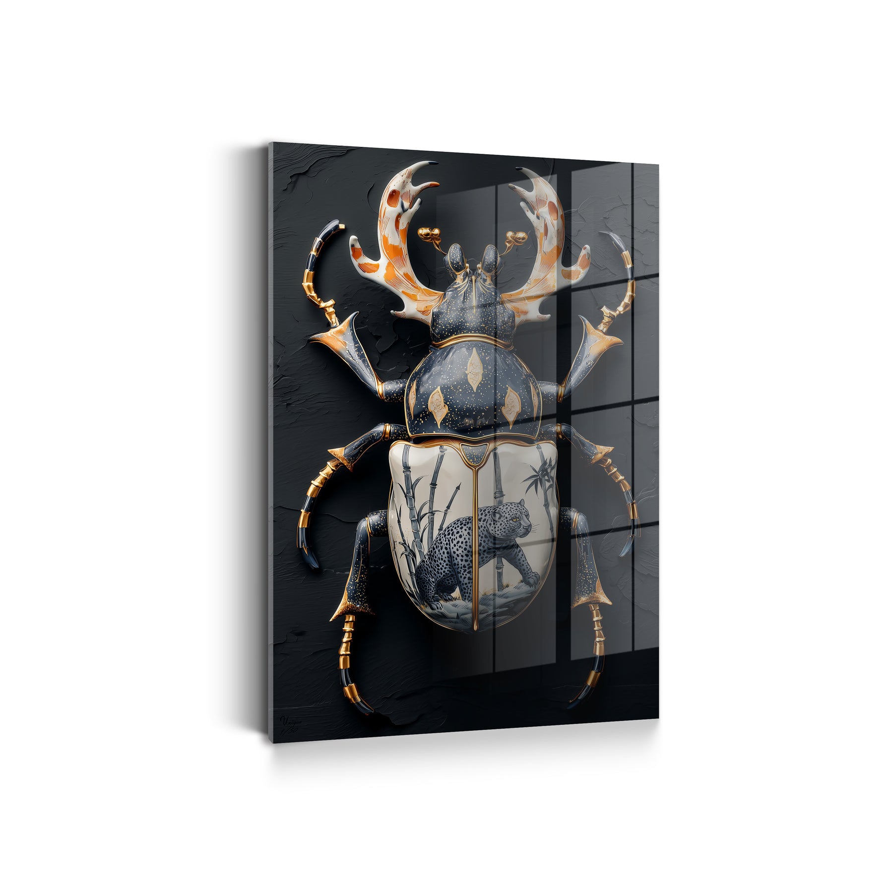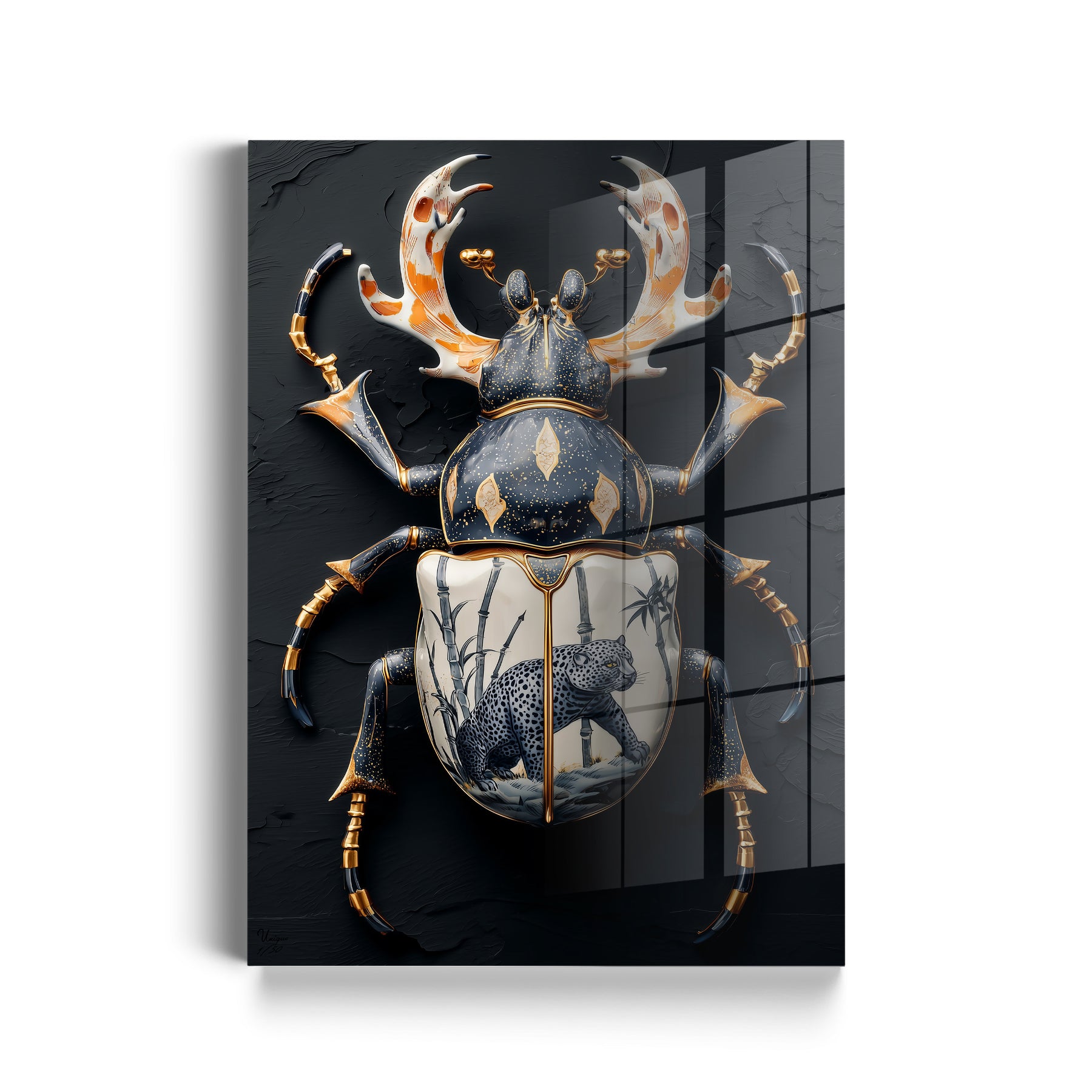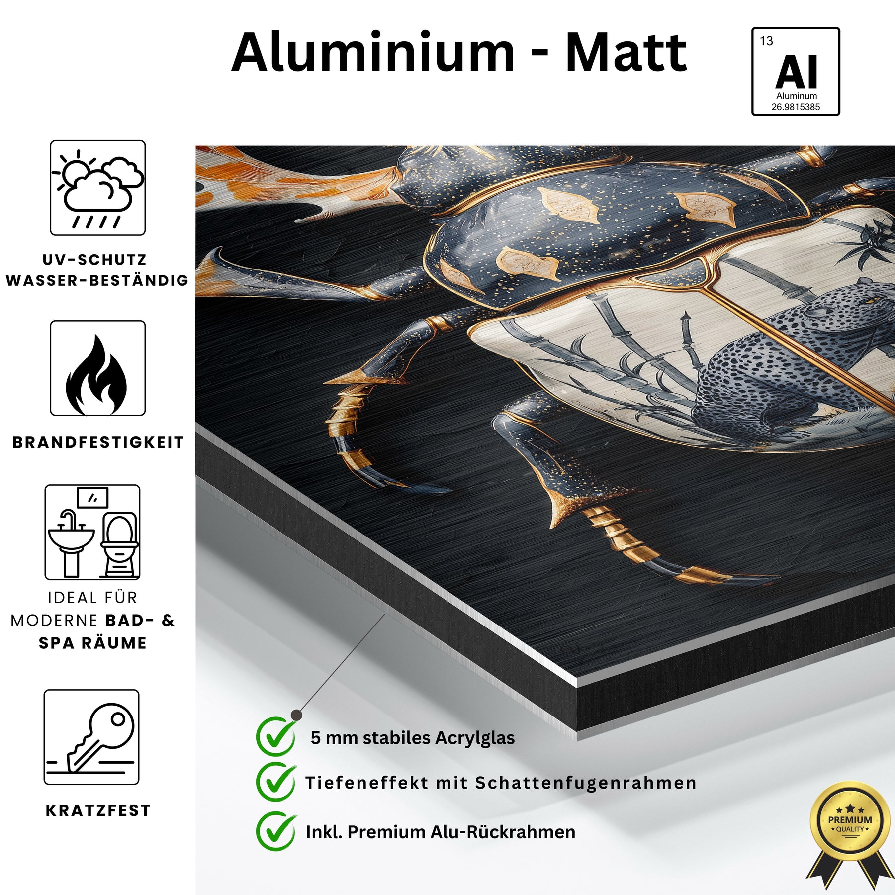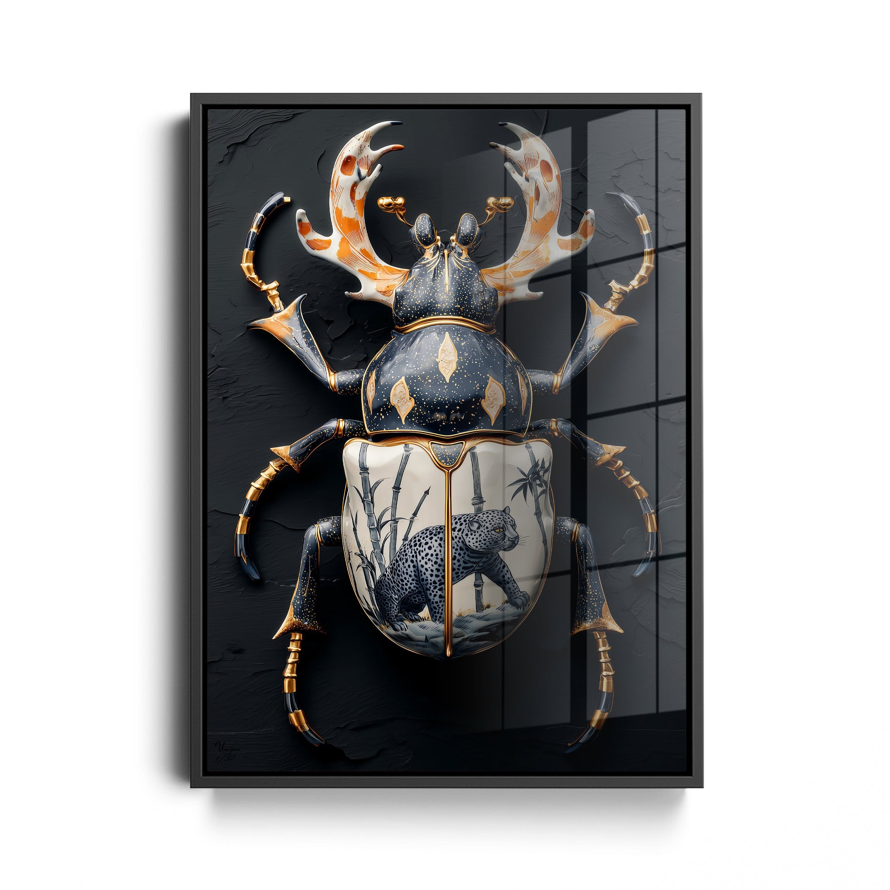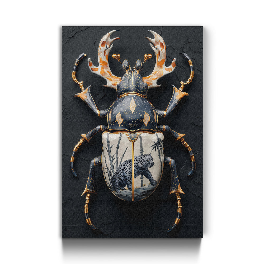 Ein detailreicher, schwarz-goldener Käfer, kombiniert mit einem fein illustrierten Leopard-Motiv, Bambus-Elementen und edlem Ornament-Finish.
